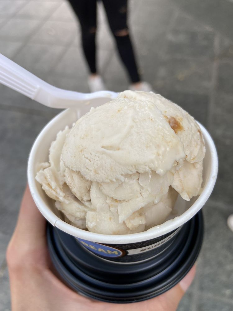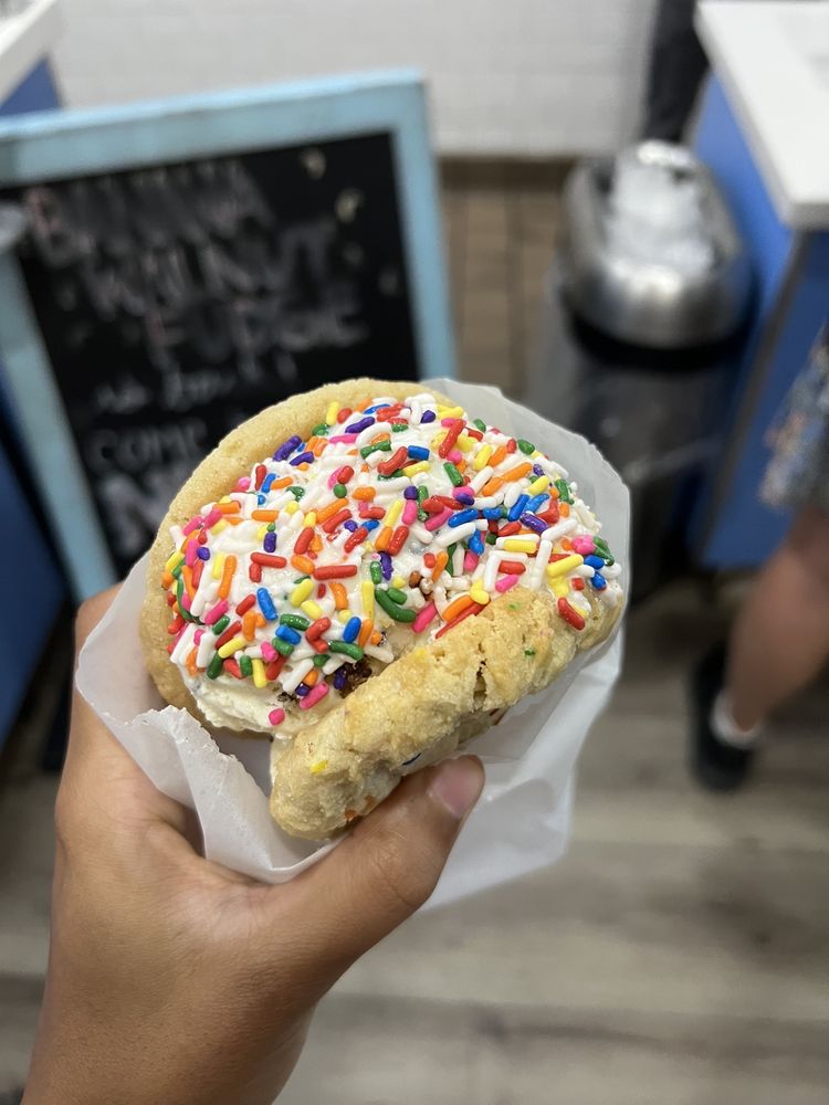 Ice cream sandwich made with super premium ice cream and two freshly baked vegan cookies. Both of which are proprietary recipes. Gluten free snickerdoodle.